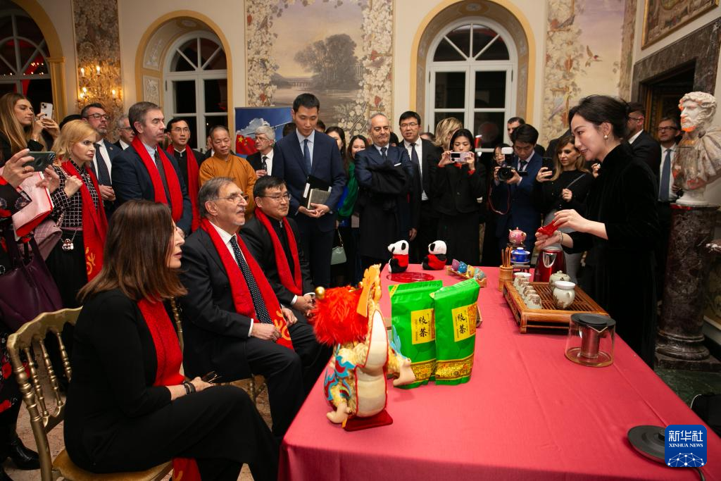 1月31日,意大利旅游部长桑坦凯、意大利参议长拉鲁萨和中国驻意大利大使贾桂德(前排由左至右)在新春招待会上体验中国茶艺。新华社记者 李京 摄