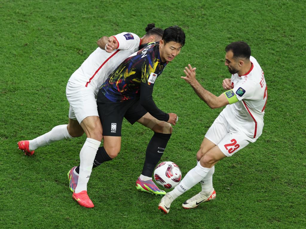 2月6日,韩国队球员孙兴慜(中)在半决赛中拼抢。新华社记者 贾浩成 摄