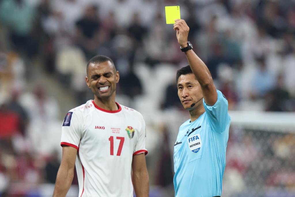 2月10日,决赛主裁判马宁(右)向约旦队球员阿亚林出示黄牌。新华社记者 丁汀 摄