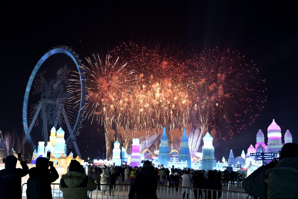 2024年1月5日,观众在开幕式上观看烟火表演。当日,第40届中国·哈尔滨国际冰雪节开幕,吸引众多游客。