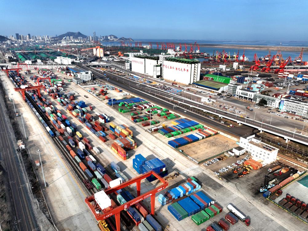 1月8日拍摄的中哈(连云港)物流合作基地装卸作业区(无人机照片)。(新华社发,王春摄)