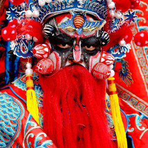据他介绍,社火脸谱早期多用青、赤、黄、白、黑5种颜色,暗合五行明辨忠奸。在色彩基础上,用云纹、水纹、火纹、月牙纹等纹饰进一步夸张变形,勾勒和放大人物特点,“脸谱色彩艳丽、画面丰富,体现着审美情趣和艺术想象力”。