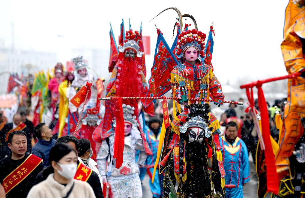陕西省宝鸡市陇县社火巡游活动上,社火队伍在展示背芯子。新华社记者 刘潇 摄