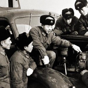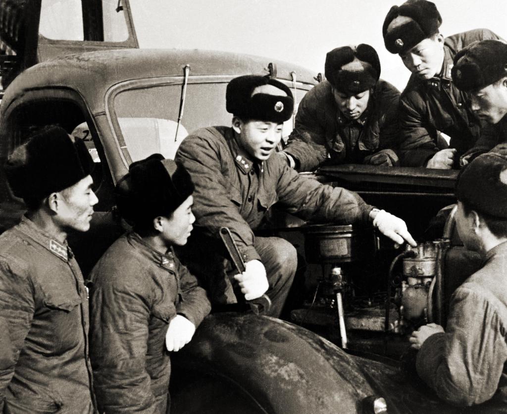 ↑1959年2月,雷锋所在鞍钢洗煤车间吊车组被评为红旗组,这是雷锋(后排右二)和工友合影。