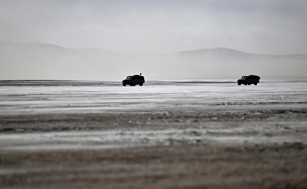 在卓乃湖附近行进,车辆在冰冻的河滩上缓慢行驶。汽车压过冰面,雪面留下车辙印。巡山队员介绍,通过车辙印,他们不仅可以判断出汽车数量,还能推测出车辆到达的大致时间。