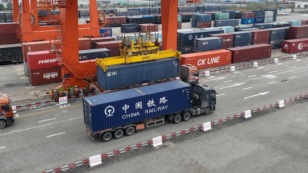 2024年3月1日,在天津港北疆港区C段智能化集装箱码头,起重机搬运集装箱。新华社记者 单宇琦 摄