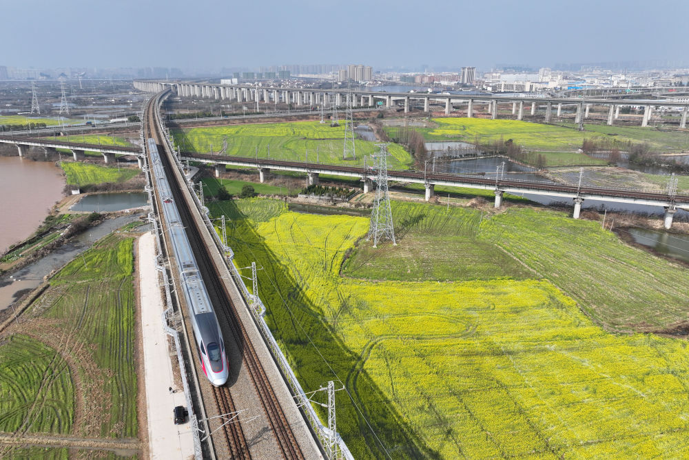 2024年3月2日,一辆高铁列车从江西省南昌市南昌县一处油菜花田旁驶过(无人机照片)。新华社记者 金良快 摄