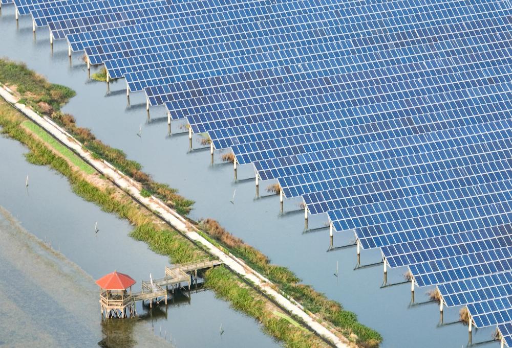 2023年10月11日拍摄的江苏省兴化市千垛镇连片的光伏发电板(无人机照片)。新华社发(周社根 摄)
