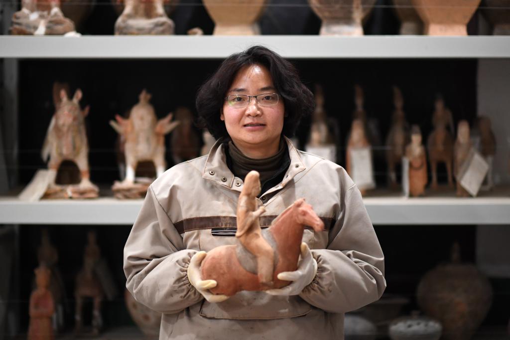 3月5日,陕西省考古研究院女子考古队文保技师王小娟手捧一件正在修复的出土文物。新华社记者 李一博摄