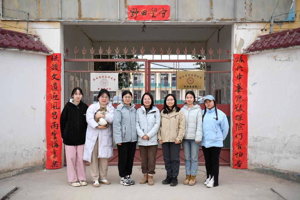 3月5日,陕西省考古研究院女子考古队部分成员谭施玥、余明蓉、王红英、朱瑛培、张佳杨、郭结、陈凡(从左至右)在驻地门前合影。新华社记者 李一博摄