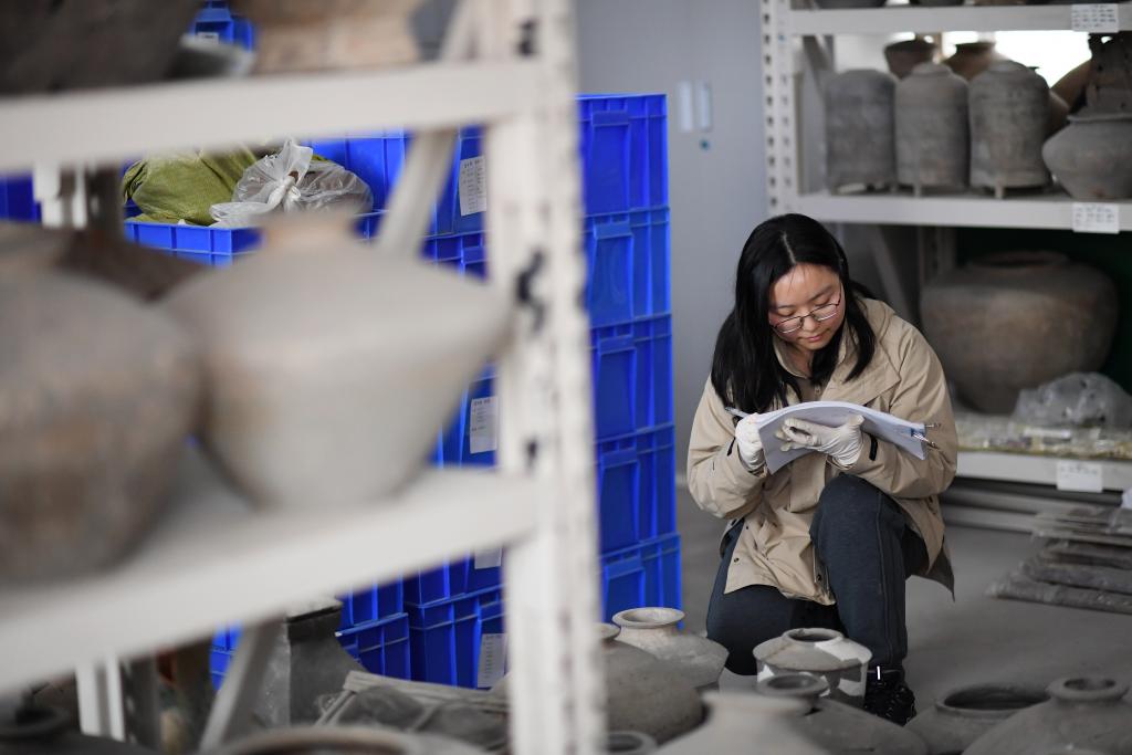 3月5日,陕西省考古研究院女子考古队队员张佳杨在库房对文物进行登记造册。新华社记者 李一博摄