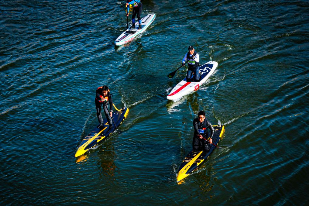 资料图:在水上滑行的桨板运动爱好者。(梅雅婷 摄)