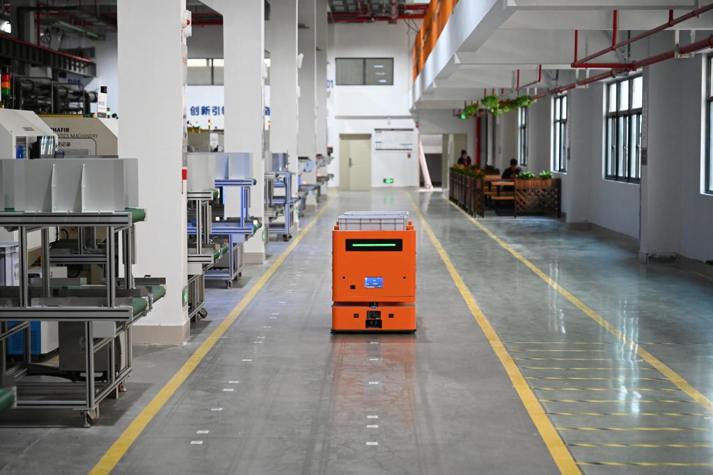在福建泉州南安市九牧智能马桶“绿色黑灯灯塔工厂”,5G自动导引运输车在车间进行运输作业。新华社记者 周义 摄