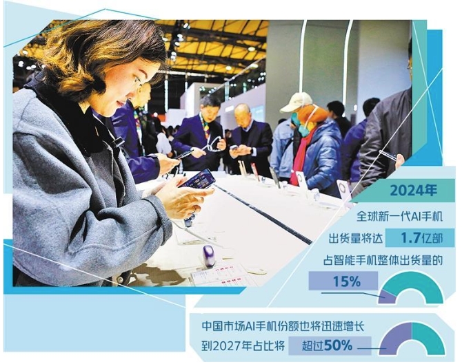 市场调研机构Canalys预计,2024年全球智能手机出货总量中,预计约5%会搭载端侧AI运算能力。国际数据公司IDC认为,2024年全球新一代AI手机出货量将达1.7亿部,占智能手机整体出货量的15%。中国市场AI手机份额也将迅速增长,到2027年占比将超过50%。