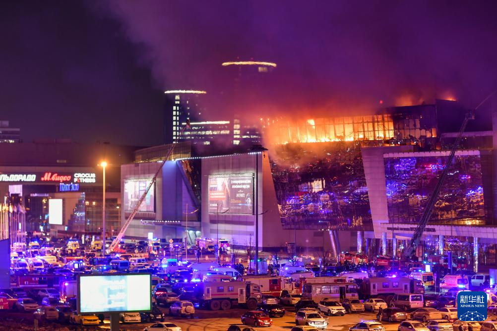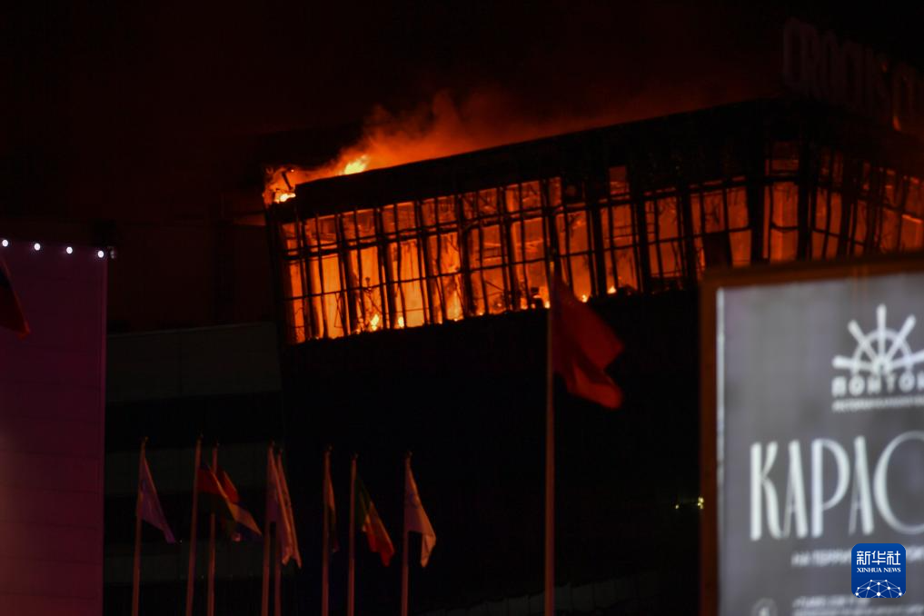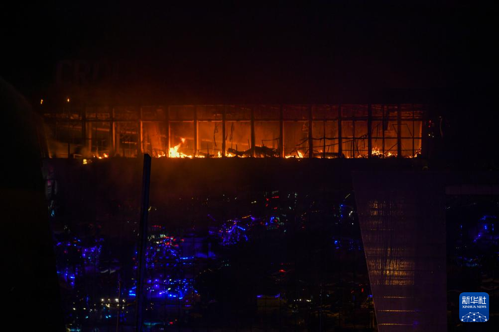 3月22日,俄罗斯莫斯科近郊克拉斯诺戈尔斯克市一音乐厅发生枪击事件后引发火灾。新华社记者 曹阳 摄