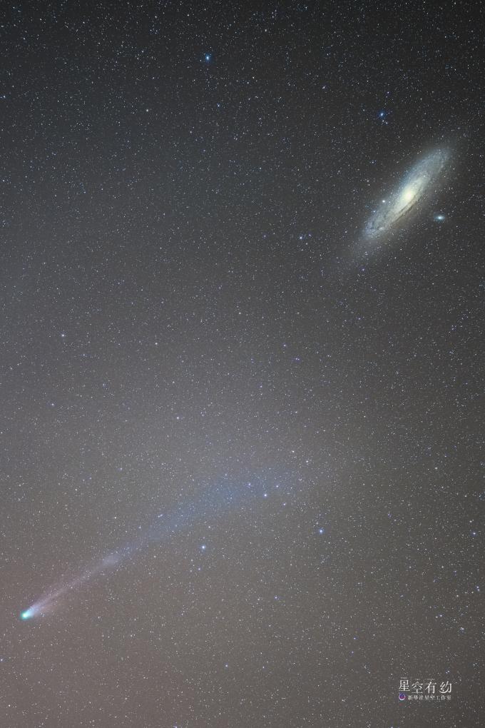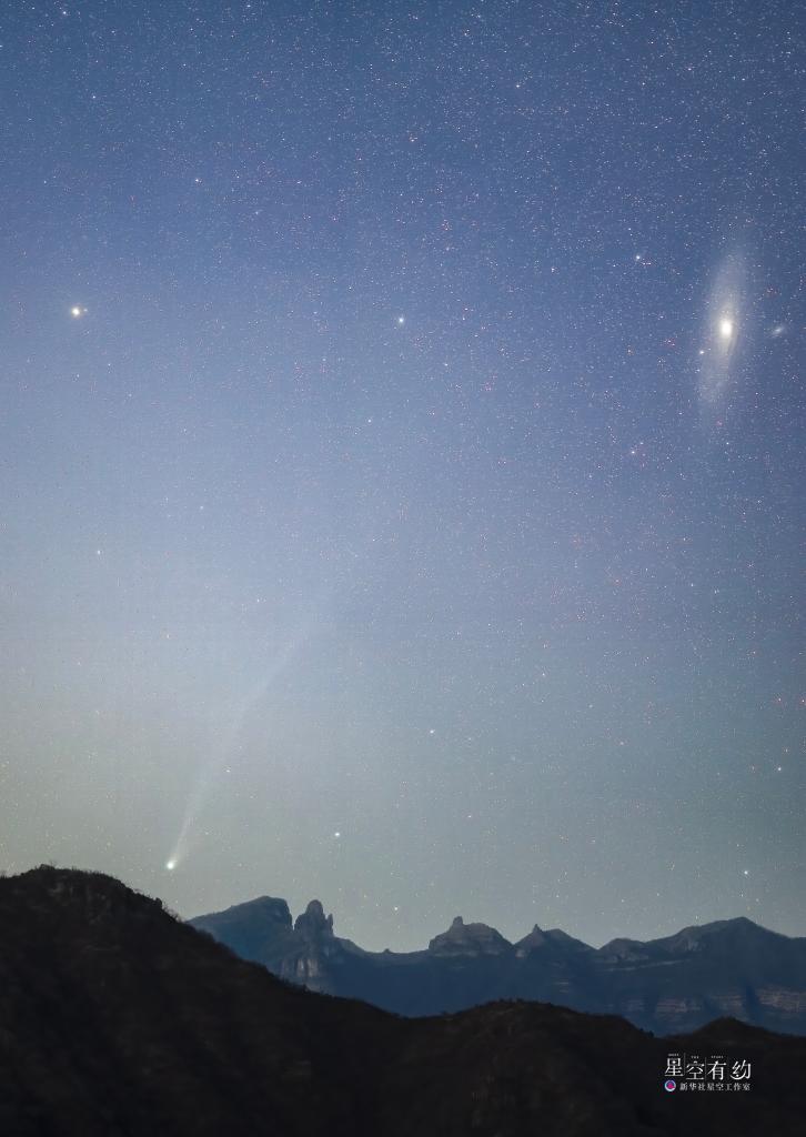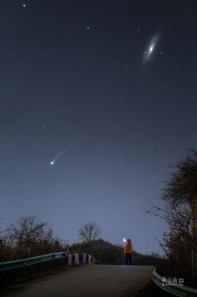 12P彗星与另外一个天体M31距离比较近,很多人会在刚入夜或者蓝调时刻(日落后太阳位于地平线以下的一段时间)尾声的时候,拍摄这两个天体“同框”的画面。