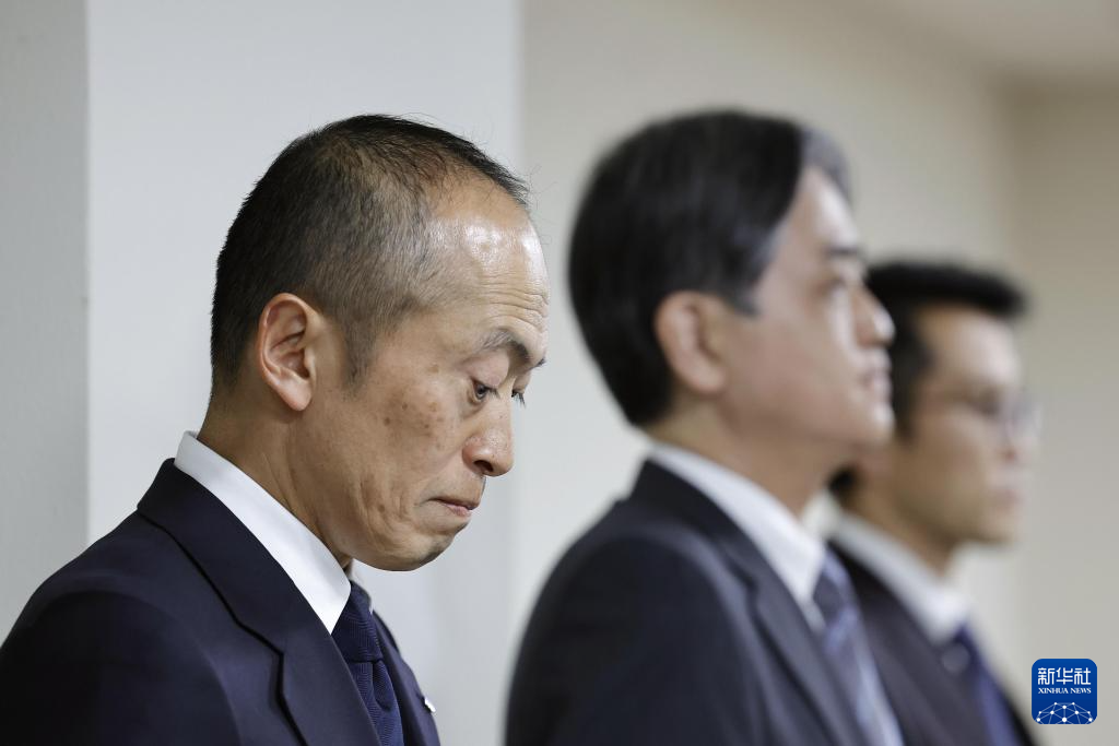 3月22日,在日本大阪,小林制药公司社长小林章浩(左一)在记者见面会上。新华社/共同社