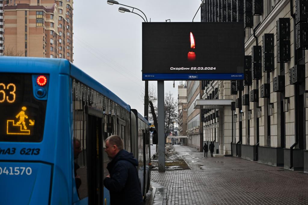3月23日,俄罗斯首都莫斯科街头的广告牌播出蜡烛图案,悼念莫斯科近郊恐袭事件遇难者。新华社记者曹阳摄