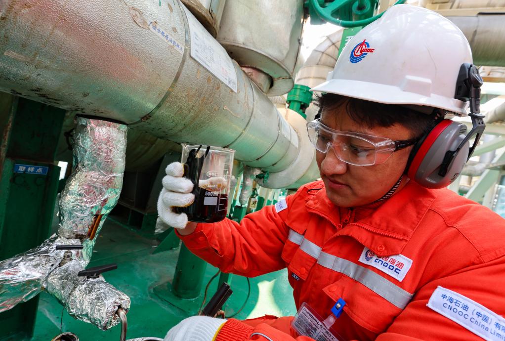 强巴在“渤海世纪号”(FPSO)上检查原油油样(3月7日摄)。 新华社记者 姜帆 摄
