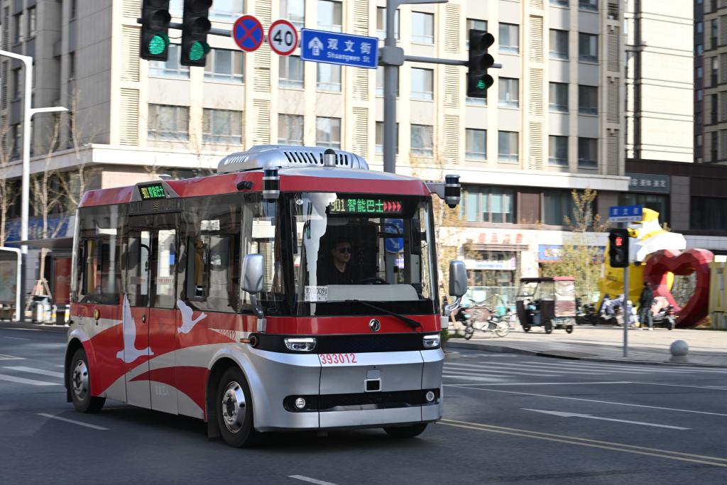 3月29日,无人驾驶智能网联巴士在雄安新区容东片区道路上行驶。新华社记者 牟宇 摄