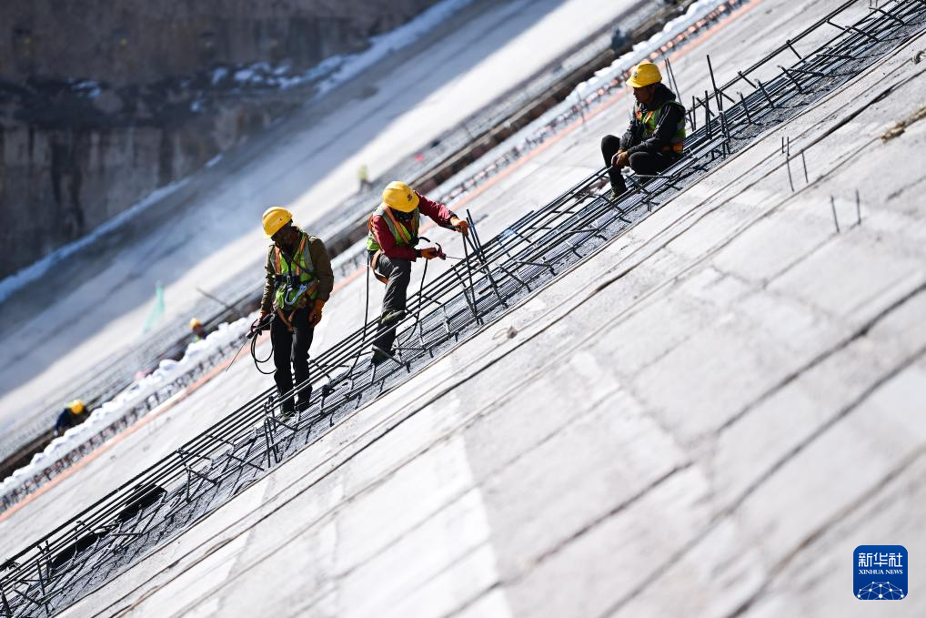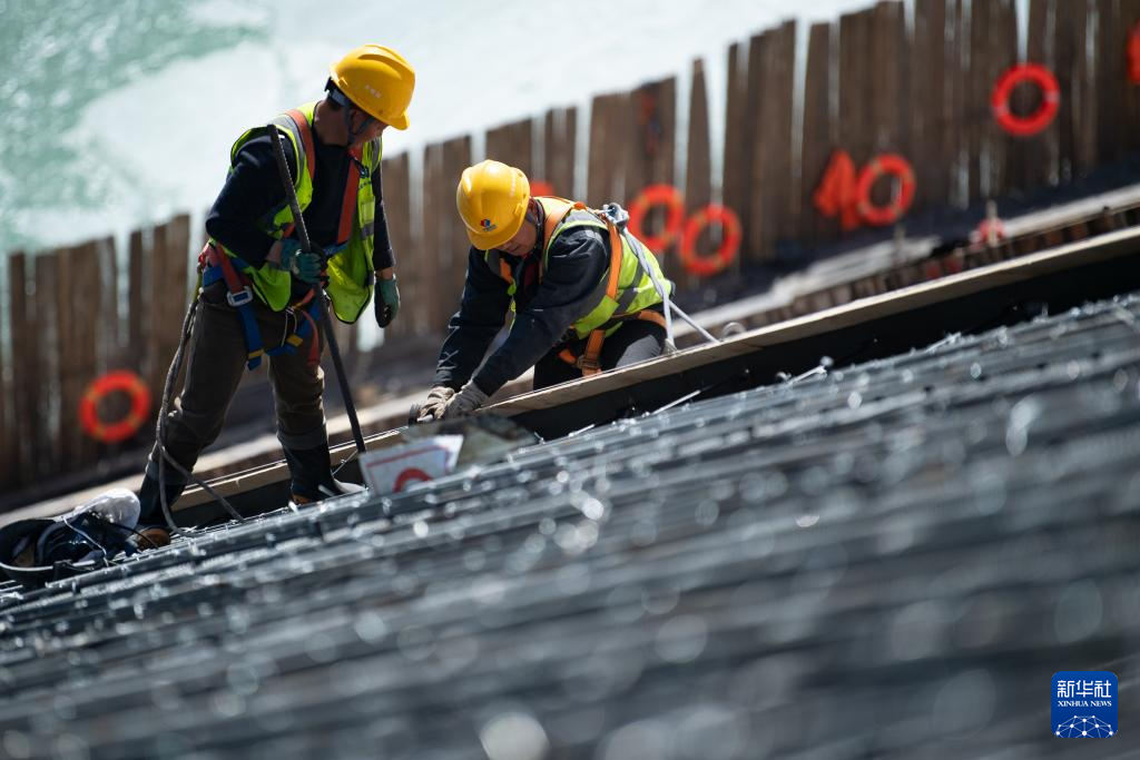 4月1日,玛尔挡水电站工作人员在坝体上施工。新华社发(潘彬彬摄)