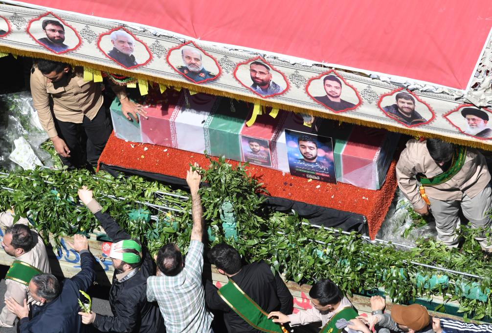 4月5日,在伊朗德黑兰,人们参加伊朗驻叙使馆遭袭事件中丧生的7名伊朗伊斯兰革命卫队成员的葬礼。新华社记者沙达提摄