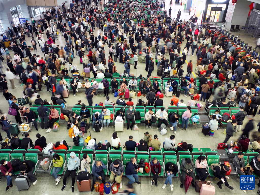 4月6日,旅客在铁路湖南衡阳东站候车室候车(无人机照片)。新华社发(曹正平 摄)