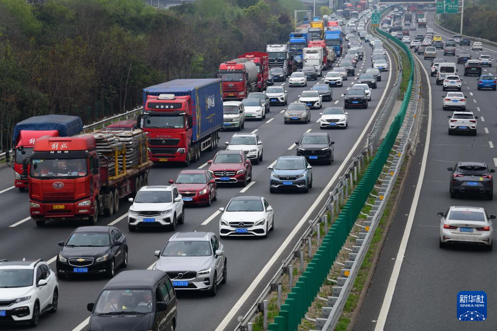 4月6日,在沪蓉高速公路江苏无锡段,去往上海方向的车辆缓慢通行。新华社发(还月亮 摄)