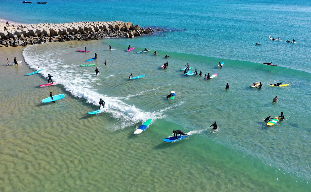 ↑游客在海南万宁日月湾体验冲浪。新华社记者郭程摄