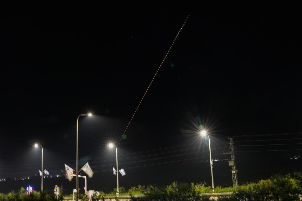这是4月14日凌晨在以色列北部城市谢莫纳拍摄的以色列防空系统启动拦截的画面。新华社发(阿亚尔·马戈林摄/基尼图片社)
