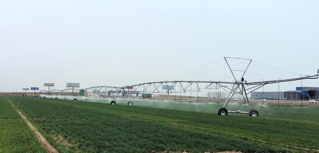 中原农谷里,农民使用全自动平移式喷灌机进行灌溉作业。新华社记者刘金辉 摄