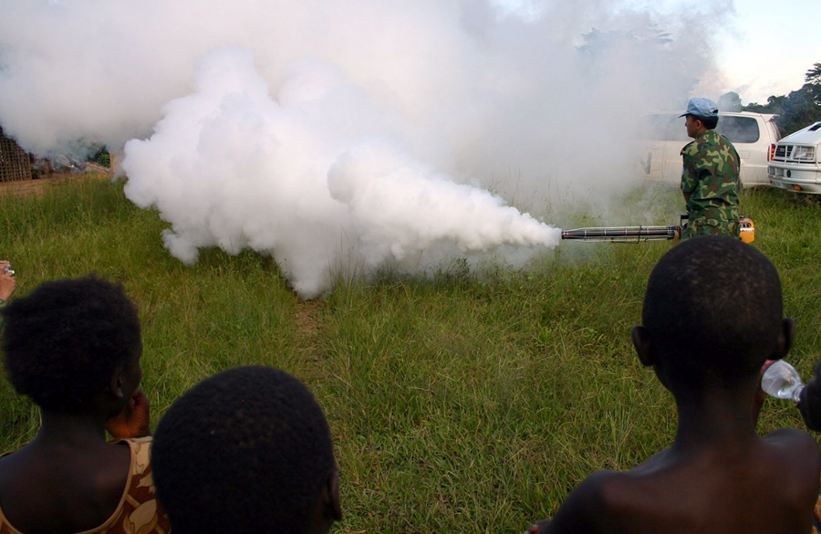 2004年10月10日,在利比里亚绥德鲁附近村庄,中国赴利比里亚维和医疗分队防疫医生使用喷雾机灭杀蚊虫以预防疟疾等疾病。