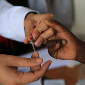2018年12月8日,在马拉维南部布兰太尔市卡迪迪村卫生院,第六批中国援马拉维医疗队医生在义诊活动中为当地居民检测疟疾。