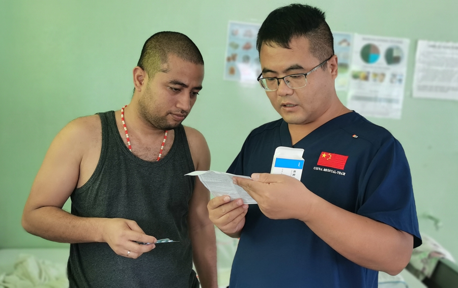 2024年3月24日,中国医疗队队员为塔巴内(左)赠送药物并讲解如何用药。塔巴内出现头痛头晕、全身酸痛、精神不振等症状长达一个多月,但当地医生均未查到病因。经过中国医疗队详细检查后,塔巴内被确诊为疟疾感染。医疗队将当时仅有的5盒国产抗疟疾药物(双氢青蒿素哌喹片)赠送给患者和汤格鲁中央医院。经治疗后,塔巴内的血涂片检查显示疟疾完全消失。新华社发(第三批援基里巴斯中国医疗队供图)