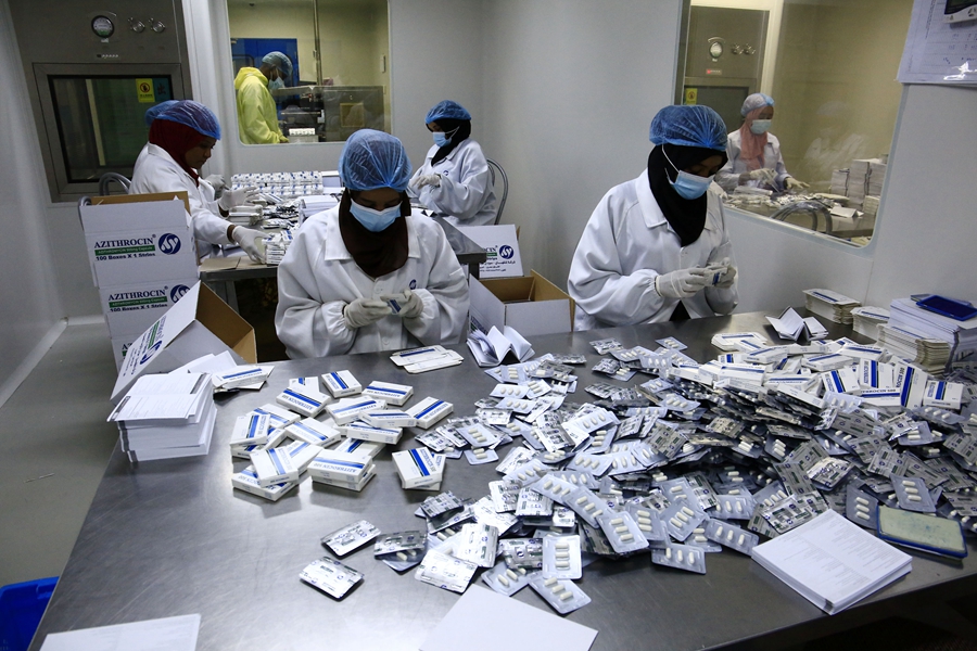 2022年4月24日,当地员工在苏丹北喀土穆的上海-苏丹制药有限公司分装药品。该公司是上海医药公司与苏丹国家药品供应基金在1998年成立的合资企业,也是非洲地区最早实现青蒿素类抗疟药本地化生产的中外合资企业。
