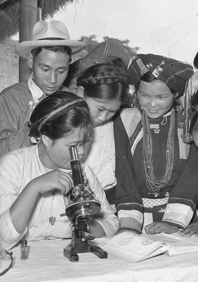云南省德宏傣族景颇族自治州芒市开办少数民族卫生人员训练班,吸收了一批各民族青年参加学习,使他们成为各村寨开展卫生防疫工作的骨干。这是学员们用显微镜观察疟疾病的疟原虫。(1957年4月27日发)