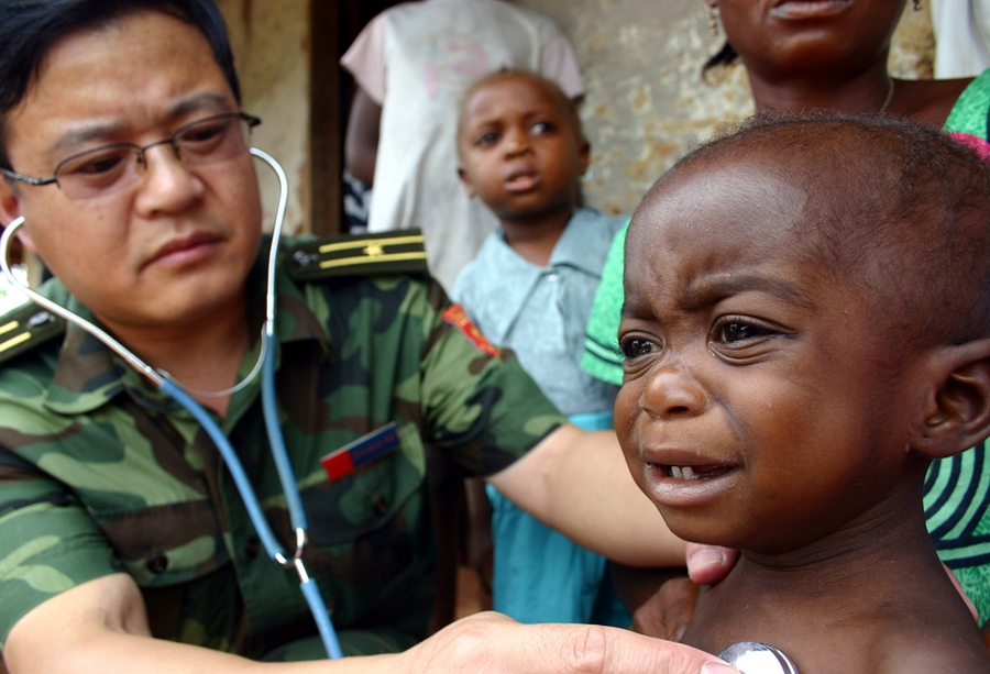 2004年10月11日,中国赴利比里亚维和工兵分队医生谢正国正为6个月大的婴儿伊万检查身体。几天前伊万的双胞胎姐姐因患疟疾而死,同样染上疟疾的伊万则因幸运地得到了中国医生的医治而活了下来。
