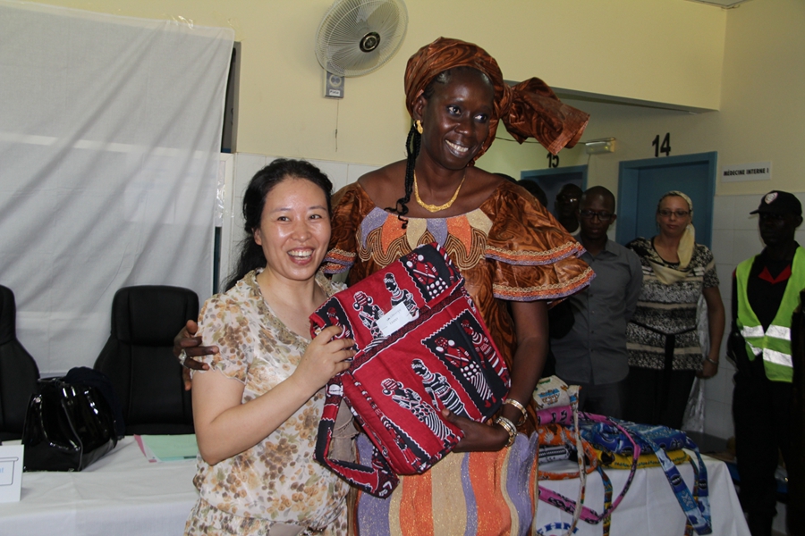 2013年9月4日,在塞内加尔比基纳国家医疗中心,中国援塞第14批医疗队的一名队员从塞比基纳国家医疗中心院长手中接过嘉奖状。当日,塞内加尔政府嘉奖中国援塞第14批医疗队队员及中国政府赠送中塞疟疾病防治中心诊疗设备物资交接仪式在这里举行。
