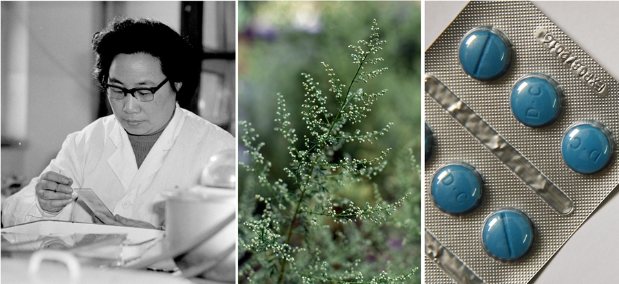这是屠呦呦、青蒿和抗疟疾成药的拼版资料照片。1972年11月8日,中国科学家屠呦呦和她的团队在这种植物身上发现了青蒿素的奥秘。从此,这个发现作为世界卫生组织治疗疟疾的“首要疗法”。
