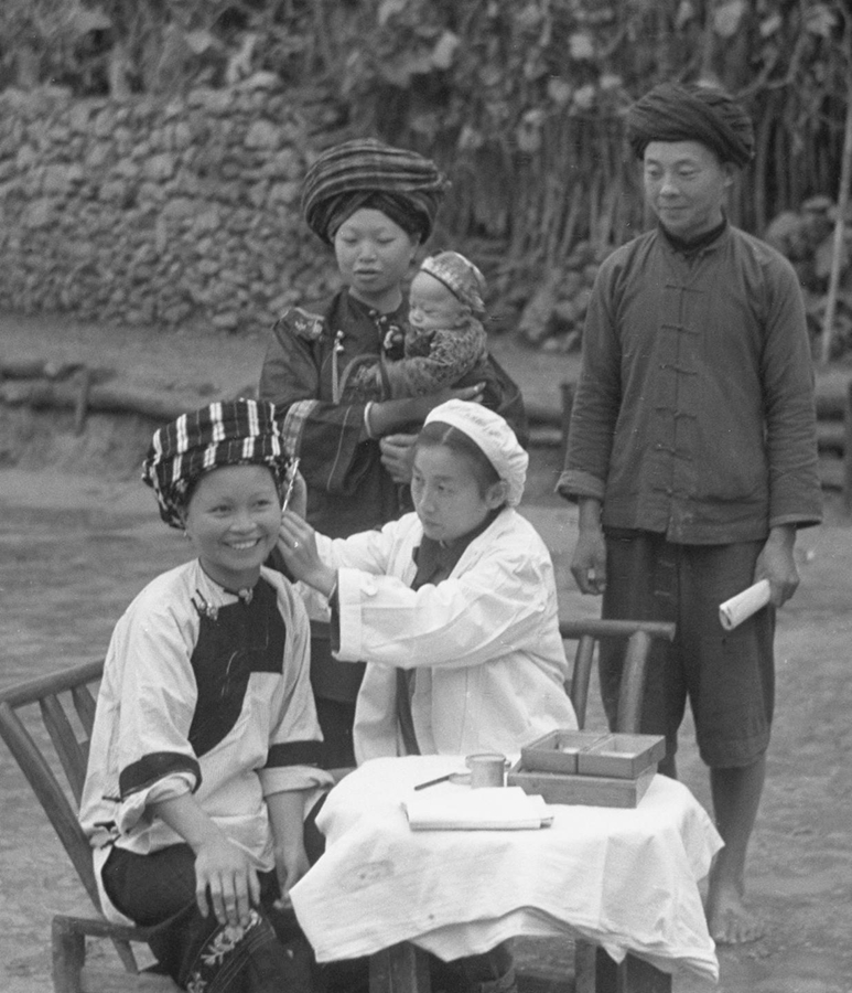 在湖南省湘西土家族苗族自治州,疟疾防治工作者给苗族人民抽血做血片检查。(1957年10月18日发)
