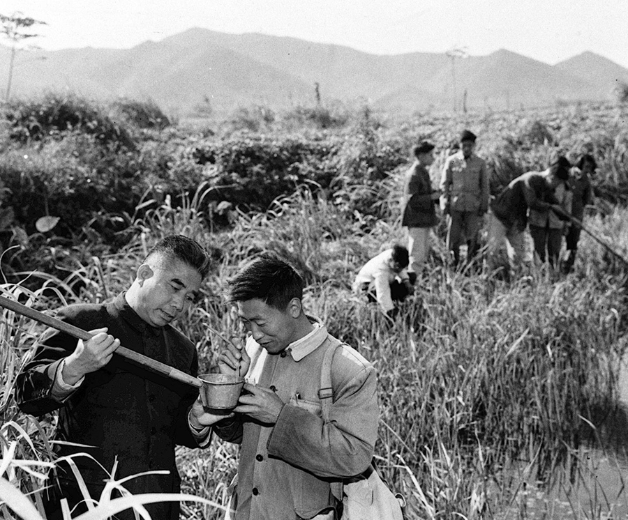 昆虫学家何琦教授(左)带领他的助手和浙江省安吉县防疫人员在该县野外水草丛生地带采集传播疟疾的蚊幼虫,准备研究当地疟蚊分布情况,以便进一步开展防治工作。(1962年11月7日发)