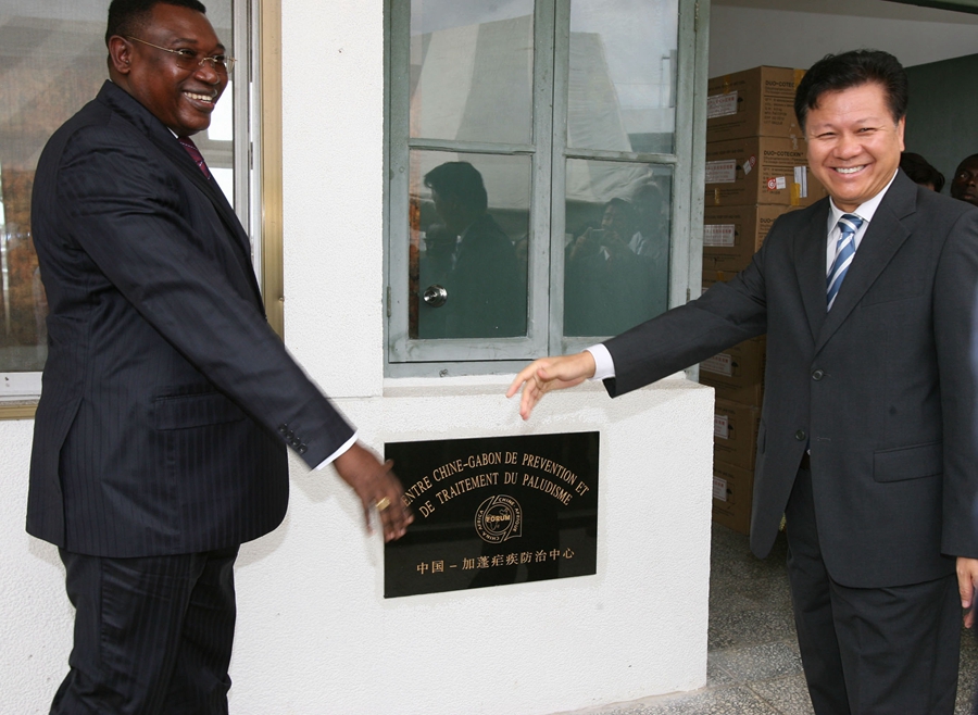 2008年9月26日,中国驻加蓬大使薛金维(右)与加蓬负责公共卫生事务的部长级代表孔巴·苏维在利伯维尔中加合作医院出席中国-加蓬疟疾防治中心揭牌仪式。在2006年举行的中非合作论坛北京峰会上,中国政府决定帮助非洲建立一批疟疾防治中心,加蓬的疟疾防治中心就是其中之一。