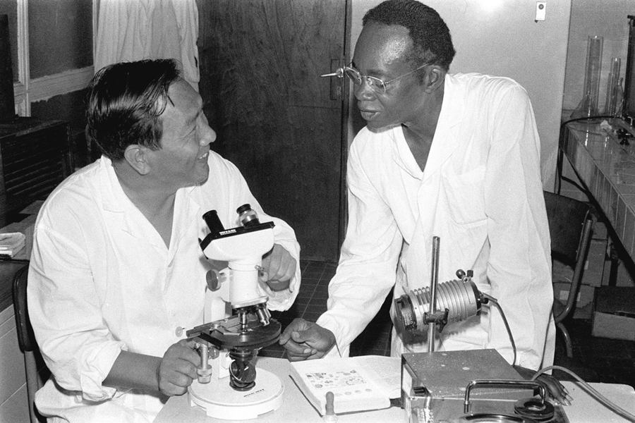 中国赴扎伊尔医疗队在扎伊尔(即今天的刚果民主共和国)首都金沙萨金丹堡医院工作,他们救死扶伤,传授技术,学习经验,取得较好成绩,受到当地居民的好评。在扎伊尔的中国医疗队对非洲流行的疟疾进行研究。这是中国医务人员和金丹堡医院化验室主任交流。(1979年3月23日发)