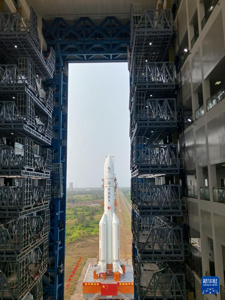 4月27日,嫦娥六号探测器和长征五号遥八运载火箭器箭组合体开始转运。新华社发(黄国畅 摄)