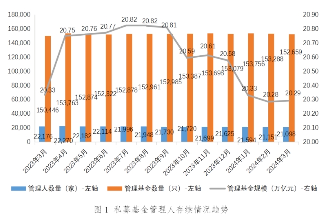 截至2024年3月末,存续私募基金152659只,存续基金规模20.29万亿元。其中,存续私募证券投资基金96509只,存续规模5.51万亿元;存续私募股权投资基金31074只,存续规模11.05万亿元;存续创业投资基金23996只,存续规模3.27万亿元。(记者刘羽佳、刘慧)