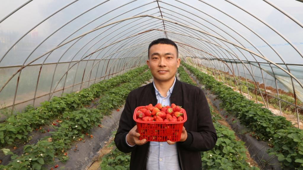 杨伟展示新时代家庭农场新收获的草莓。(受访者供图)