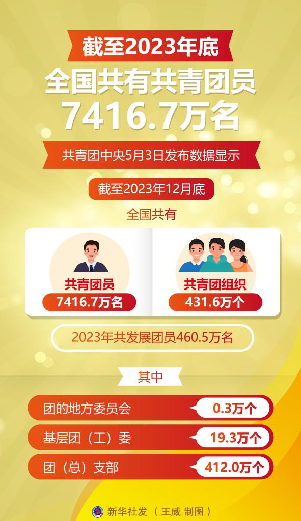 新华社北京5月3日电 共青团中央3日发布数据显示,截至2023年12月底,全国共有共青团员7416.7万名,共青团组织431.6万个。2023年共发展团员460.5万名。