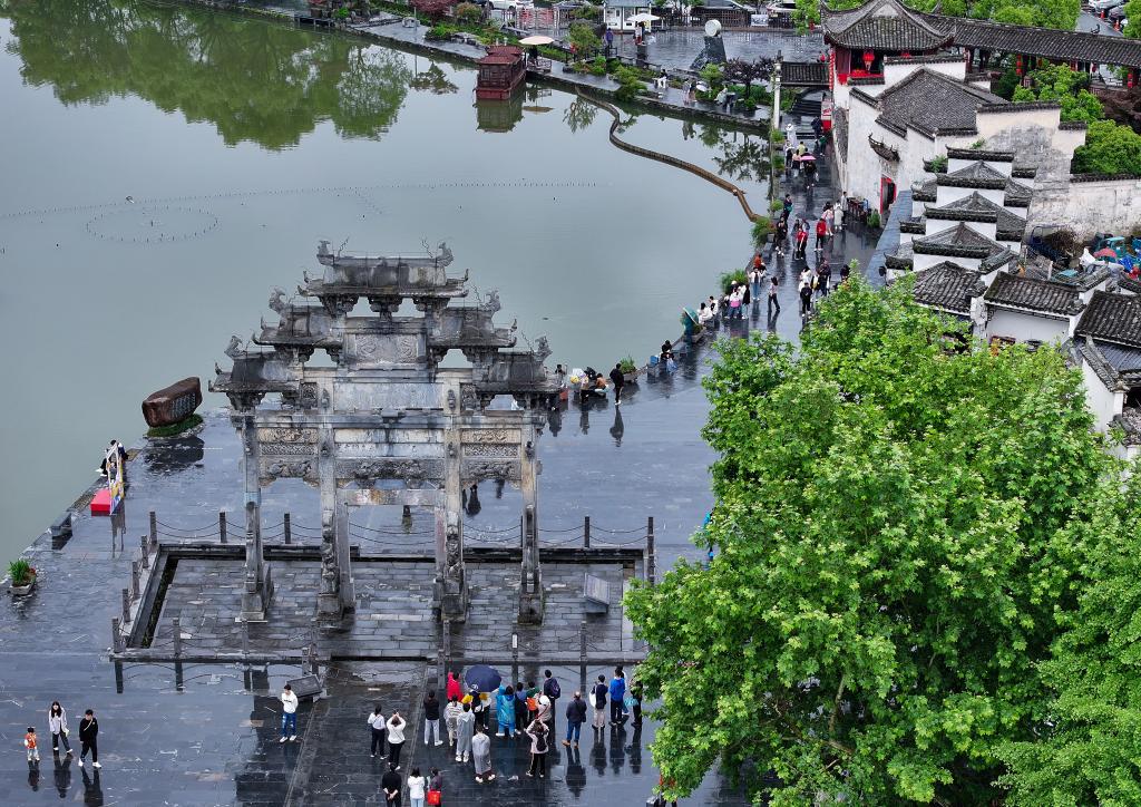 5月4日,游客在安徽省黄山市黟县西递古村游玩赏景(无人机照片)。新华社发(施亚磊摄)