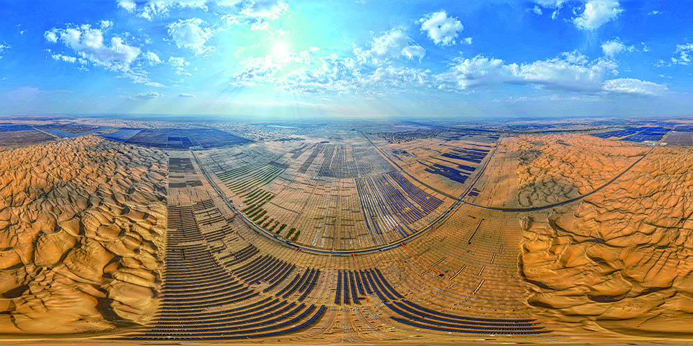 2023年10月10日拍摄的建设中的库布其沙漠鄂尔多斯中北部新能源基地。项目全部建成后,每年可向京津冀地区送电约400亿千瓦时。新华社记者达日罕摄