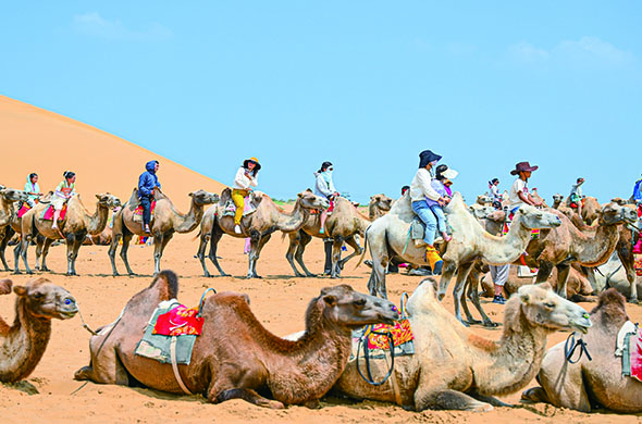 2023年7月29日,游客在鄂尔多斯市达拉特旗境内库布其沙漠中的银肯塔拉景区体验骑骆驼。新华社记者彭源摄